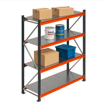 - Rafturi metalice Polirack™ pentru depozitare medie, cu polițe metalice incluse.