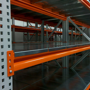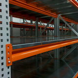 Document archiving or light storage shelves 200-350 kg/level with metal shelves included. The crossbars (horizontal profiles) are available in four lengths: L:120 cm, L:150 cm, L:180 cm and L:210 cm. The crossbars with screwless fastening systems are height adjustable and allow you to adjust the shelves very easily. The maximum weight supported on a shelf module is 2000kg/module. Table of permissible loads: Height Width Usable Depth Max. weight sup. H:250 cm 120 cm 40 cm 200 kg/level H:250 cm 150 cm 40 cm 250 kg/level H:250 cm 180 cm 40 cm 300 kg/level H:250 cm 210 cm 40 cm 350 kg/level * The price shown is for 1 module only and includes 1 upright (frame) with a height of 250 cm, a depth of 40 cm, 4 levels of crossbars with galvanized metal shelves. * The final upright (closing frame) must be added to each set of shelves and is available in the 'Complementary products' section below." Colors / Dimensions: The shelf legs are anthracite gray and the crossbars are orange. They can be produced in the desired sizes and colors for special projects or large volume orders.
