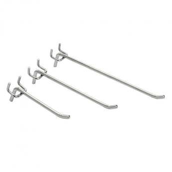 Please note: The hooks are only sold together with the perforated shelf. You cannot buy the hooks separately. Thank you for your understanding! Hook made of 5 mm thick galvanized steel wire for shelves with perforated panels. The hooks have dimensions of 10, 15, 20, 25 or 30 cm and support a weight of 1 kg. The interaxial distance is 30 mm.