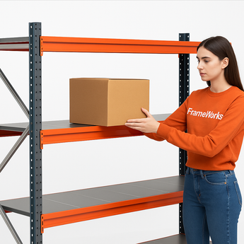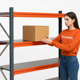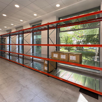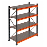 - Rafturi metalice Polirack™ pentru depozitare medie, cu polițe metalice incluse.